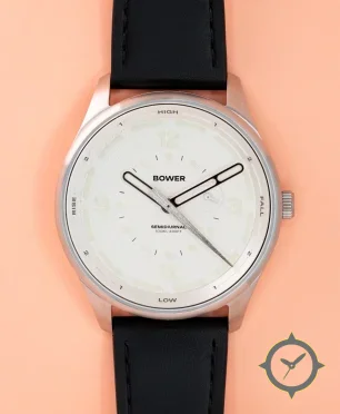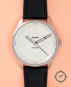 A Minimalist watch with a vintage-inspired 33mm case, crafted from stainless steel featuring a white dial with a unique textured, sand/grain finish finish.