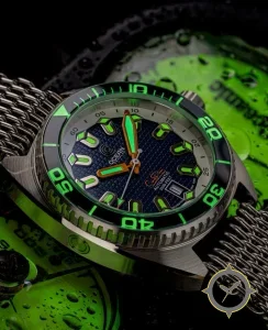 A Dive watch with a vintage-inspired 36.5mm case, crafted from stainless steel featuring a navy dial with a unique textured waffle (hobnail) finish.