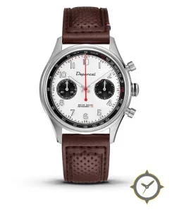 A Racing watch with a vintage-inspired 31.5mm case, crafted from stainless steel featuring a silver dial with a unique brushed (vertical) finish.