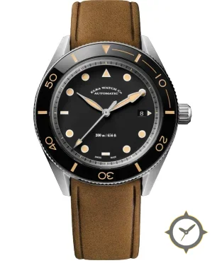 A Dive watch with a vintage-inspired 35mm case, crafted from stainless steel featuring a black dial with a unique matte finish.