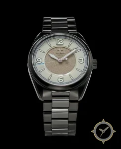 A Vintage watch with a vintage-inspired 30.5mm case, crafted from stainless steel featuring a brown dial with a unique sandblasted / grainy center with smooth outer ring finish.