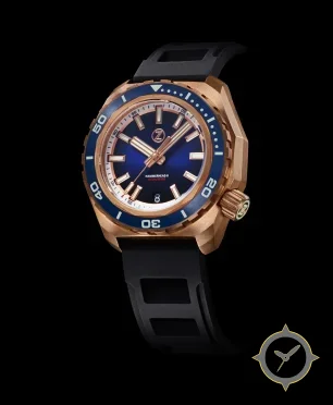 A Dive watch with a bold 49mm presence on the wrist, crafted from bronze featuring a blue dial with a unique sunburst finish.