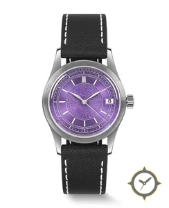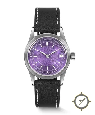 A Dress watch with a versatile 39mm case, that suits most wrists, crafted from stainless steel featuring a purple dial with a unique textured/grainy center with subtle sunburst outer ring finish.
