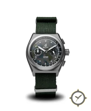 A Field watch with a versatile 38mm case, that suits most wrists, crafted from titanium featuring a green dial with a unique matte camouflage print finish.