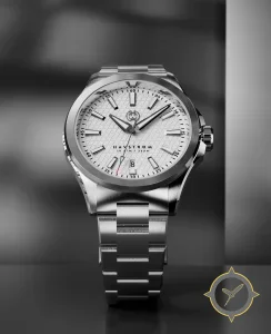 A Sports watch with a vintage-inspired 33mm case, crafted from stainless steel featuring a white dial with a unique textured triangular guilloché (repeating triangle motif) finish.