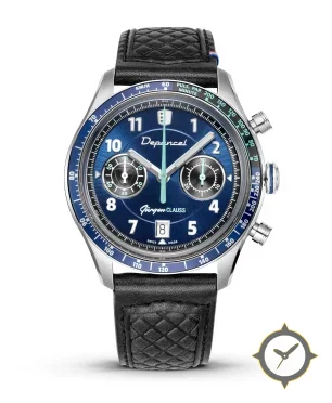 A Chronograph watch with a bold 46mm presence on the wrist, crafted from stainless steel featuring a blue dial with a unique sunburst finish.