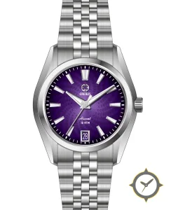 A Dress watch with a versatile 40mm case, that suits most wrists, crafted from stainless steel featuring a purple dial with a unique guilloché (radial, engraved) finish.