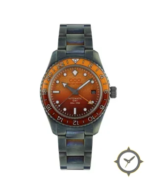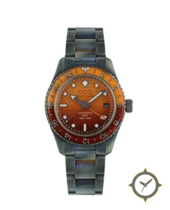 A GMT watch with a vintage-inspired 37mm case, crafted from stainless steel featuring a orange dial with a unique textured, granular sunburst with gradient (fumé) finish and a true GMT complication for tracking a second time zone.