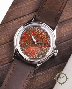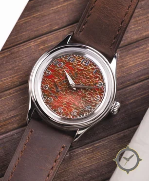A GMT watch with a vintage-inspired 36mm case, crafted from stainless steel featuring a red dial with a unique hammered / wavy textured finish finish and a true GMT complication for tracking a second time zone.