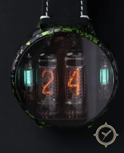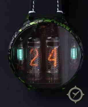 A Vintage watch with a bold 55mm presence on the wrist, crafted from Coating featuring a black dial with a unique glass window revealing exposed Nixie tubes and circuitry finish.