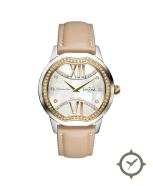 A Dress watch with a vintage-inspired 33.5mm case, crafted from stainless steel featuring a white dial with a unique mother-of-pearl finish.