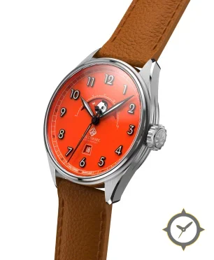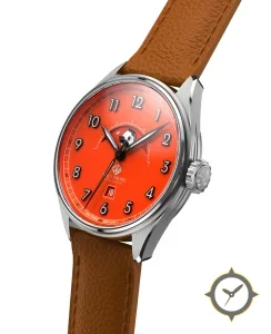 A Vintage watch with a bold 45.5mm presence on the wrist, crafted from stainless steel featuring a orange dial with a unique glossy lacquer finish.