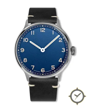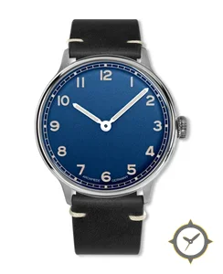 A Vintage watch with a vintage-inspired 32.5mm case, crafted from stainless steel featuring a blue dial with a unique matte, slightly grainy finish.