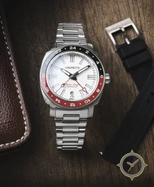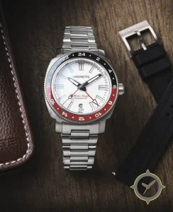 A GMT watch with a vintage-inspired 33mm case, crafted from stainless steel featuring a white dial with a unique sunburst finish and a true GMT complication for tracking a second time zone.