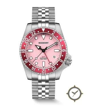 A GMT watch with a versatile 38.5mm case, that suits most wrists, crafted from stainless steel featuring a red dial with a unique matte finish and a true GMT complication for tracking a second time zone.