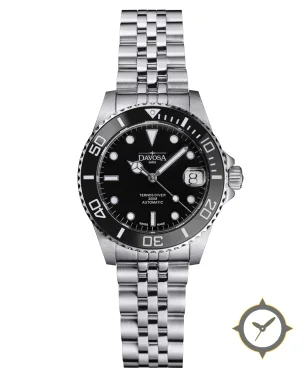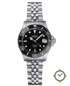 A Dive watch with a bold 42.5mm presence on the wrist, crafted from stainless steel featuring a black dial with a unique glossy finish.