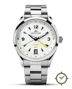 A GMT watch with a vintage-inspired 34.5mm case, crafted from stainless steel featuring a white dial with a unique matte lacquer finish and a true GMT complication for tracking a second time zone.