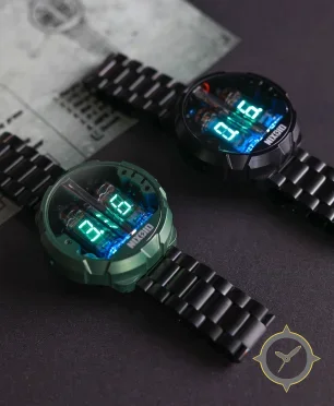 A Digital watch with a bold 42.5mm presence on the wrist, crafted from stainless steel featuring a turquoise dial with a unique transparent/exposed with visible electronic tubes finish.