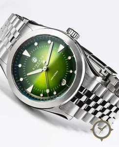 A Sports watch with a vintage-inspired 35mm case, crafted from stainless steel featuring a green dial with a unique sunburst / radial gradient finish.