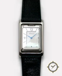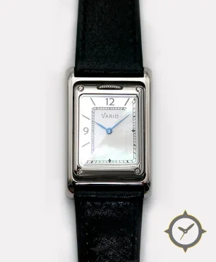 A Dress watch with a vintage-inspired 23.5mm case, crafted from stainless steel featuring a white dial with a unique mother-of-pearl finish.