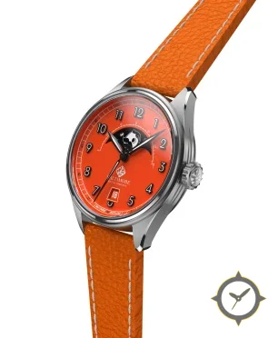 A Dress watch with a vintage-inspired 27.5mm case, crafted from stainless steel featuring a orange dial with a unique lacquer finish and a beautiful moonphase display.