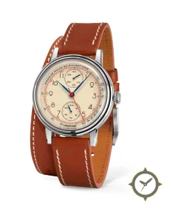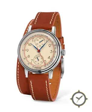 A Chronograph watch with a vintage-inspired 31.5mm case, crafted from stainless steel featuring a white dial with a unique matte finish.