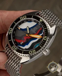 A Dive watch with a versatile 38mm case, that suits most wrists, crafted from stainless steel featuring a black dial with a unique textured, layered/topographic wave engraving finish.