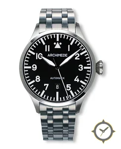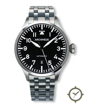 A Pilot watch with a bold 48mm presence on the wrist, crafted from stainless steel featuring a black dial with a unique matte finish.