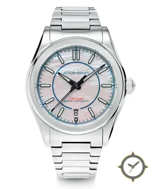 A Sports watch with a vintage-inspired 33.5mm case, crafted from stainless steel featuring a white dial with a unique mother-of-pearl finish.