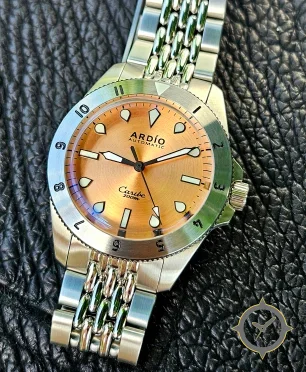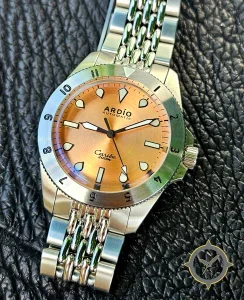 A Dive watch with a vintage-inspired 33.5mm case, crafted from stainless steel featuring a orange dial with a unique sunburst (brushed) finish.