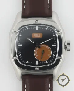 A Driver watch with a vintage-inspired 34mm case, crafted from stainless steel featuring a black dial with a unique matte/smooth lacquer finish.