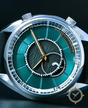 A Dive watch with a bold 43mm presence on the wrist, crafted from stainless steel featuring a green dial with a unique sunburst outer ring with textured/guilloche patterned center finish.