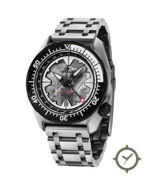 A GMT watch with a vintage-inspired 37.5mm case, crafted from stainless steel featuring a white dial with a unique textured/meteorite-style central finish finish and a true GMT complication for tracking a second time zone.