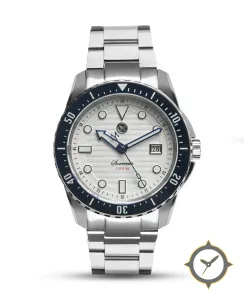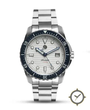 A Dive watch with a versatile 39.5mm case, that suits most wrists, crafted from stainless steel featuring a white dial with a unique horizontal wave/embossed lines finish.