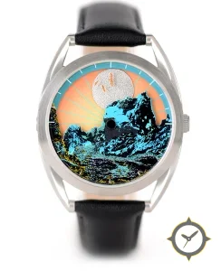 A Vintage watch with a vintage-inspired 37mm case, crafted from stainless steel featuring a turquoise dial with a unique printed illustrated scene with matte finish finish.