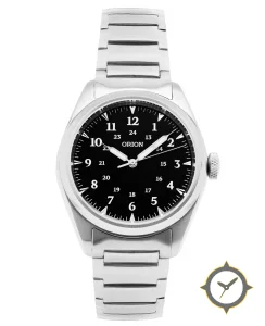 A Field watch with a bold 42mm presence on the wrist, crafted from stainless steel featuring a black dial with a unique matte finish.