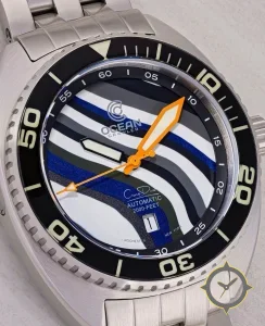 A Dive watch with a bold 44.5mm presence on the wrist, crafted from stainless steel featuring a blue dial with a unique glossy and metallic finishes with raised lumed elements finish.
