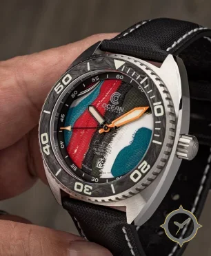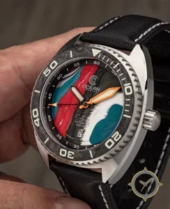 A Dive watch with a vintage-inspired 36mm case, crafted from stainless steel featuring a turquoise dial with a unique textured painted brushstroke finish (multilayer) finish.
