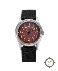 A Field watch with a vintage-inspired 34.5mm case, crafted from stainless steel featuring a red dial with a unique textured-grain finish.