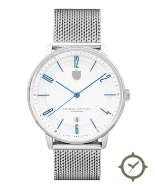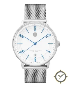 A Dress watch with a vintage-inspired 33.5mm case, crafted from stainless steel featuring a white dial with a unique lacquered, with subtle recessed concentric rings finish.