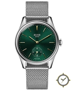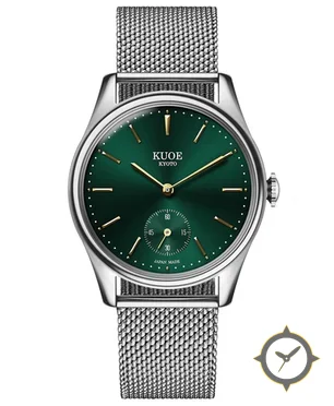 A Dress watch with a vintage-inspired 34mm case, crafted from stainless steel featuring a green dial with a unique sunburst finish.