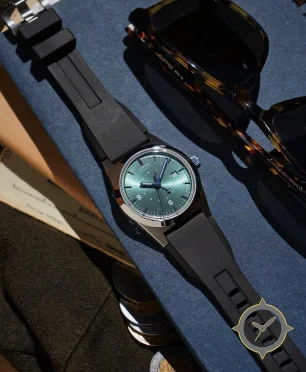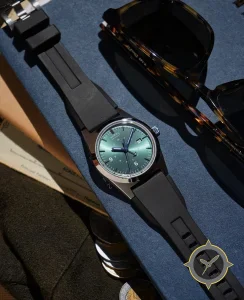 A GMT watch with a vintage-inspired 36.5mm case, crafted from stainless steel featuring a green dial with a unique sunburst finish and a true GMT complication for tracking a second time zone.