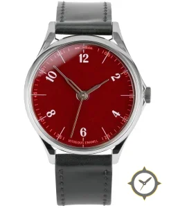 A Dress watch with a bold 47.5mm presence on the wrist, crafted from stainless steel featuring a red dial with a unique vitreous enamel finish.