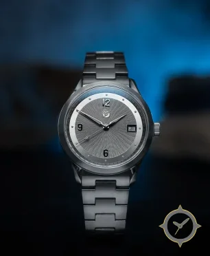 A Dress watch with a vintage-inspired 36.5mm case, crafted from stainless steel featuring a gray dial with a unique wavy guilloche (engine-turned) finish.