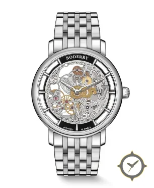 A Skeleton watch with a vintage-inspired 35.5mm case, crafted from stainless steel featuring a silver dial with a unique openworked/skeleton finish.