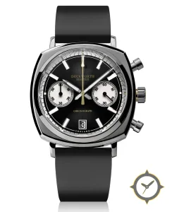 A Chronograph watch with a vintage-inspired 35.5mm case, crafted from stainless steel featuring a black dial with a unique sunburst finish.