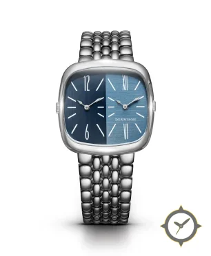 A Dress watch with a vintage-inspired 31.5mm case, crafted from stainless steel featuring a blue dial with a unique vertical brushed finish (sunray/linear brushing) finish.