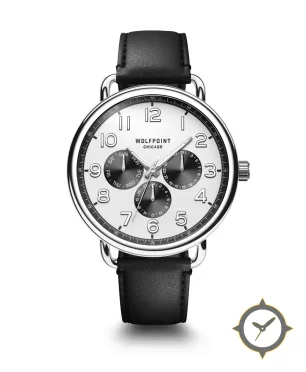 A Chronograph watch with a bold 43mm presence on the wrist, crafted from stainless steel featuring a white dial with a unique smooth finish.