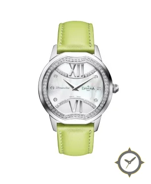 A Dress watch with a vintage-inspired 35mm case, crafted from stainless steel featuring a white dial with a unique mother-of-pearl finish.