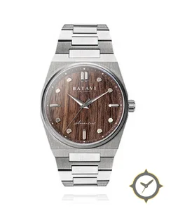 A Luxury watch with a vintage-inspired 33mm case, crafted from stainless steel featuring a brown dial with a unique wood-grain finish.